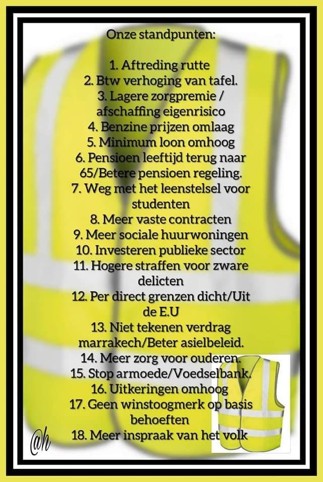 * Stop de discriminatie van het MKB, de boeren, provincialen, vissers, ouderen, lager opgeleiden, armen, de LBTG gemeenschap en ontelbaar veel anderen die door de regering worden gediscrimineerd door oneerlijke regels. Afschaffen van het Huis van Oranje.